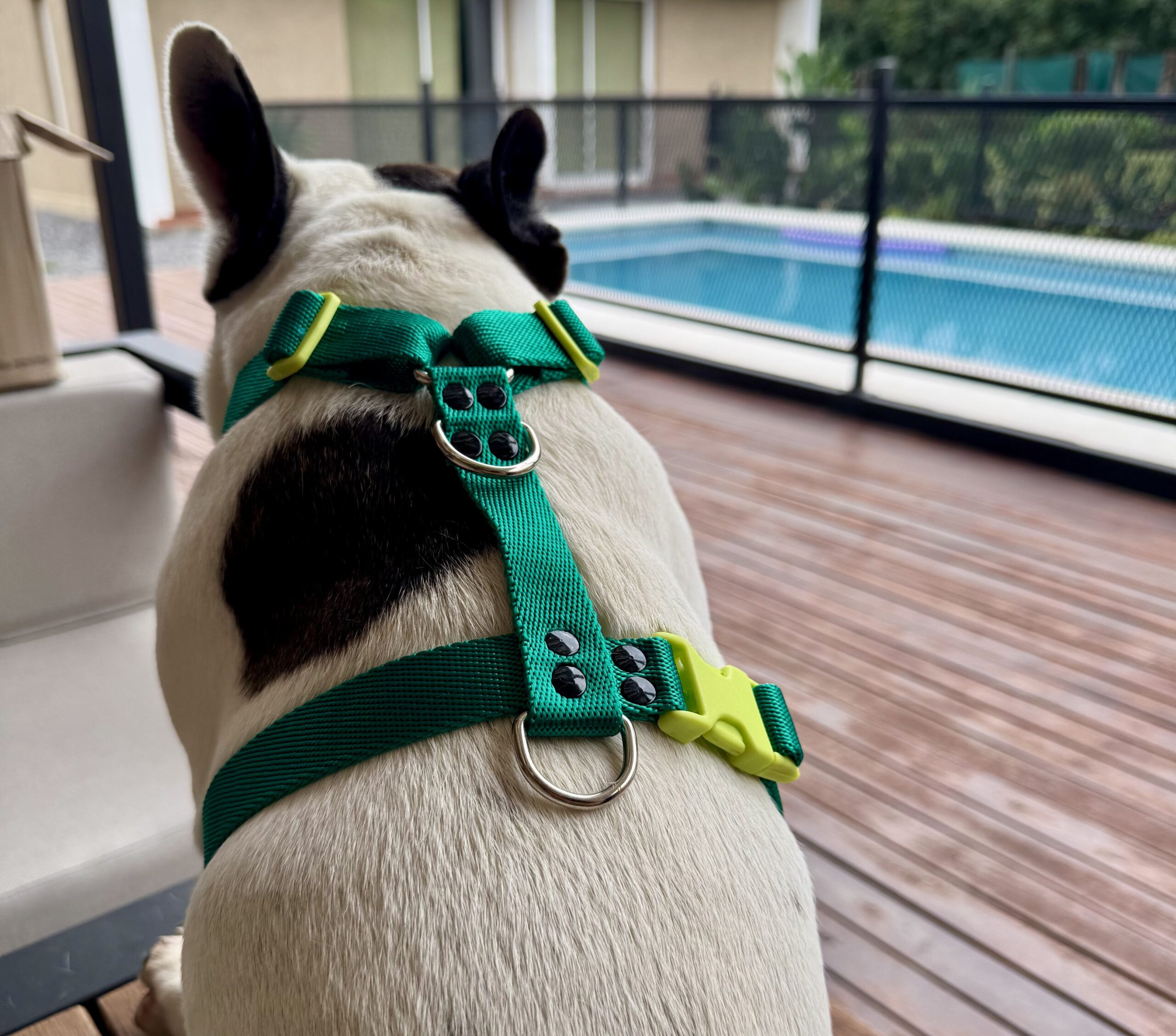 El pretal está confeccionado con cinta de polipropileno reforzado, lo que garantiza una excelente durabilidad sin sacrificar la comodidad del animal.