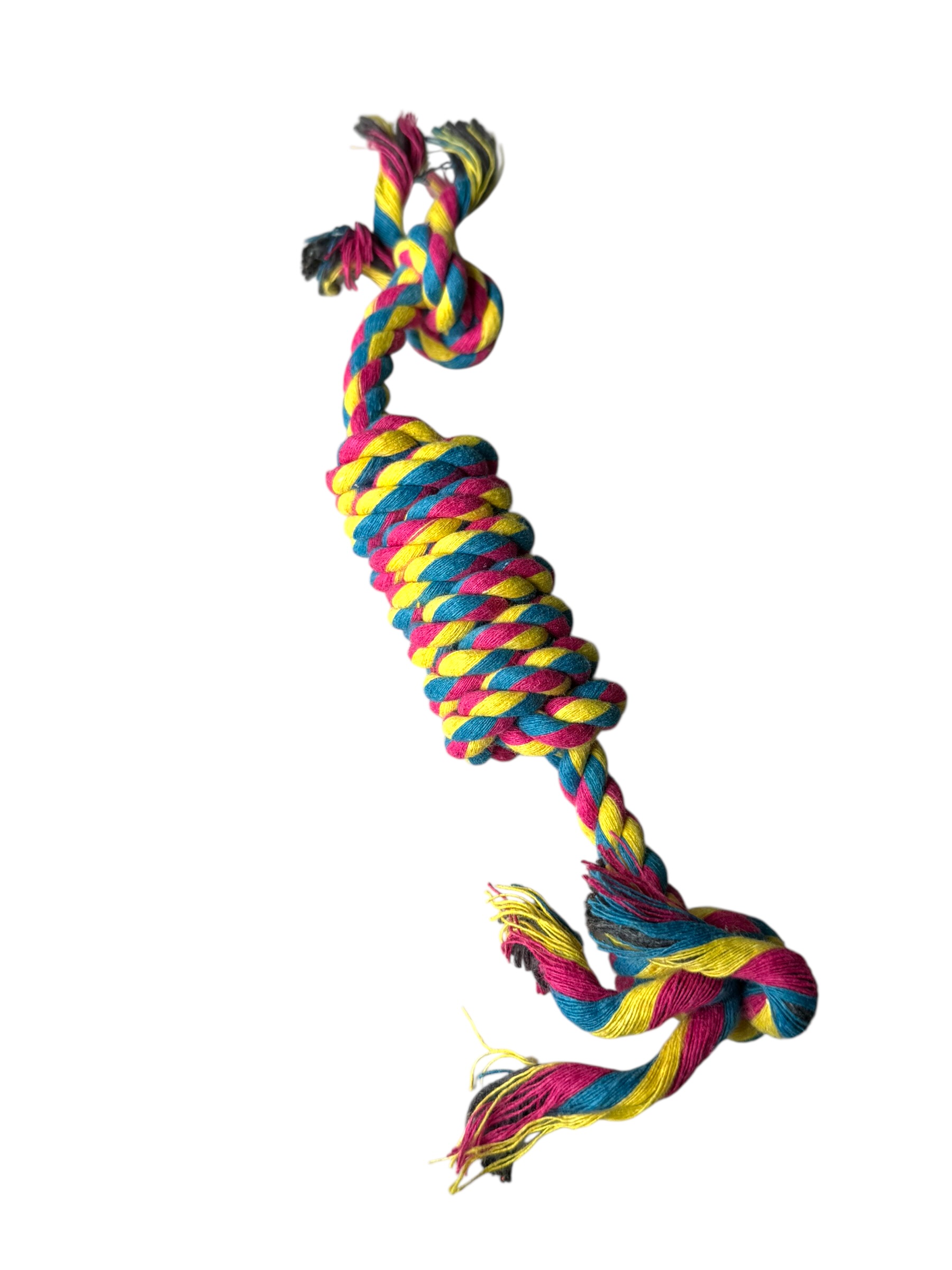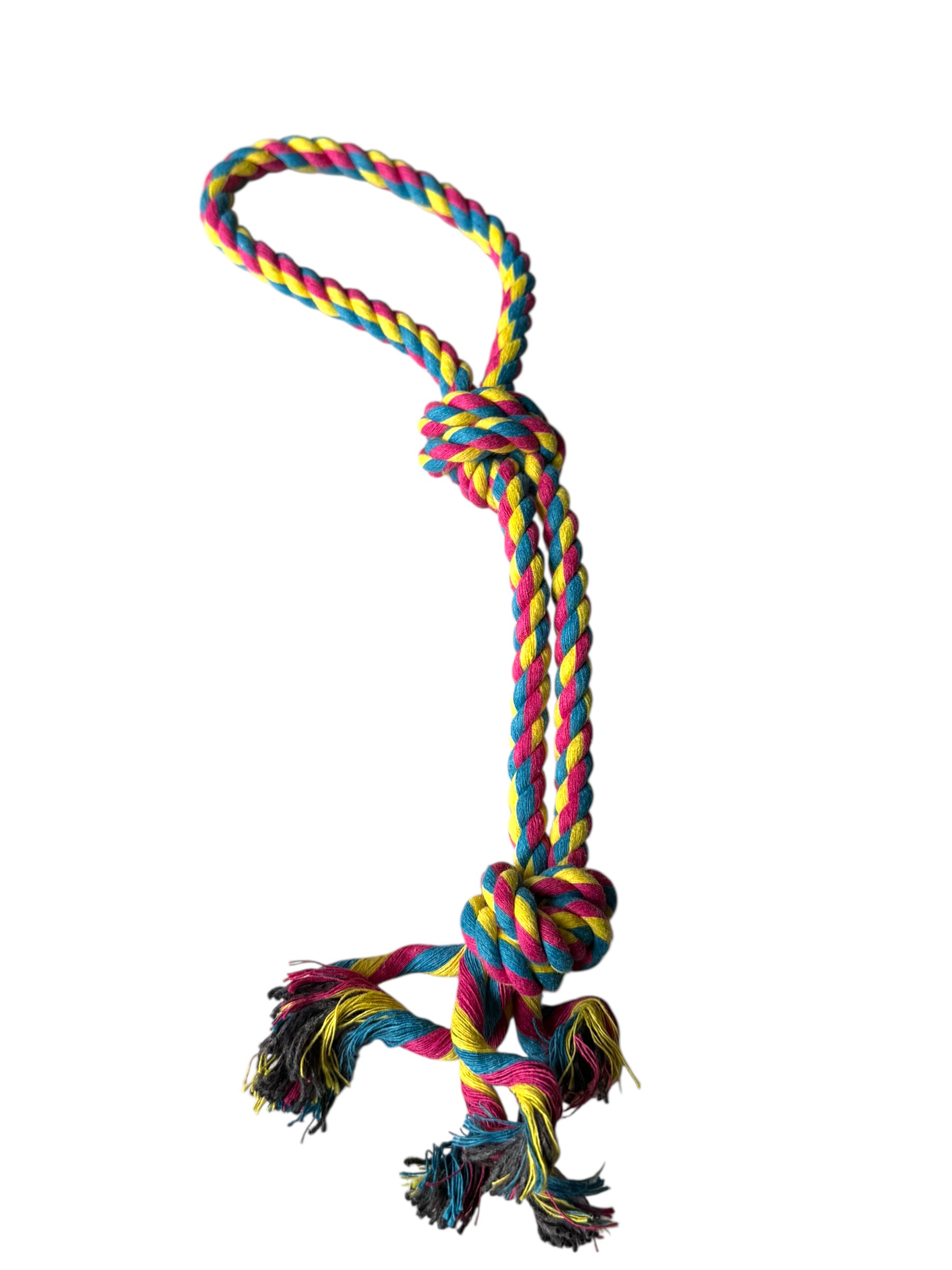 Este kit de 4 piezas es el aliado perfecto para mantener a tu perro activo, entretenido y con una dentadura sana. Fabricado con fibras de algodón trenzadas de alta resistencia en una vibrante combinación de colores azul, amarillo y fucsia.